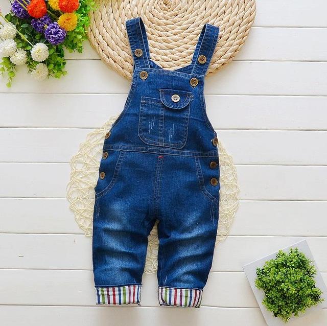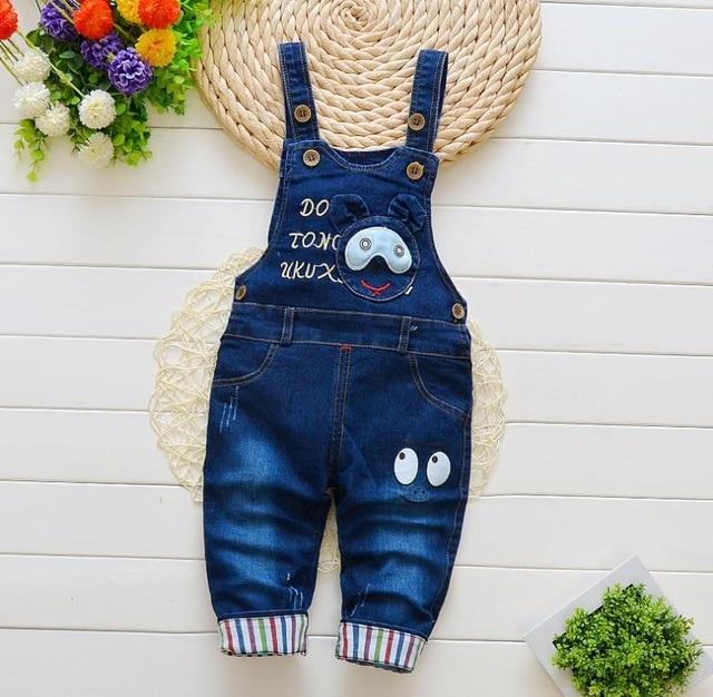 Pantalones de mezclilla para niños con tirantes. Varios motivos alegres.