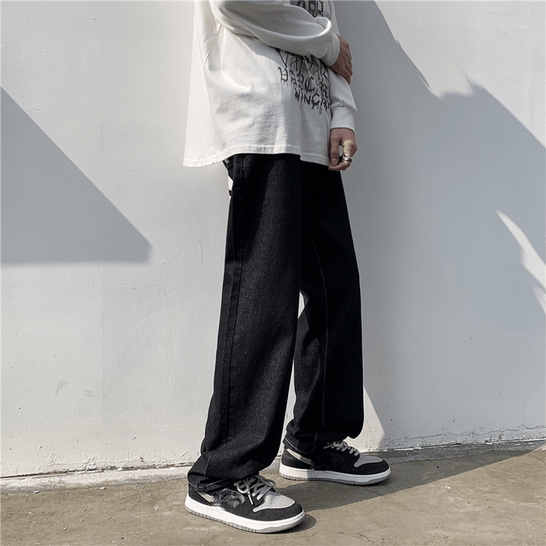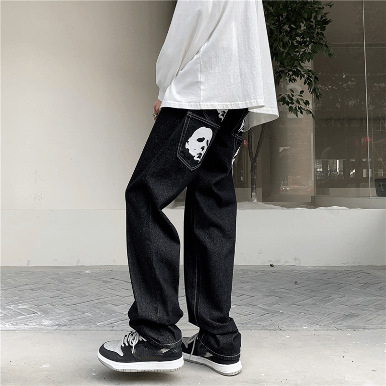 Estilosos jeans negros con estampados en la parte superior del pantalón.