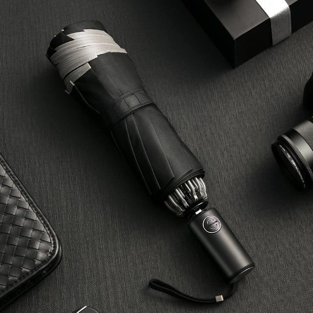 Paraguas plegable con franjas reflectantes. Está diseñado para hombres. Es muy resistente al viento.