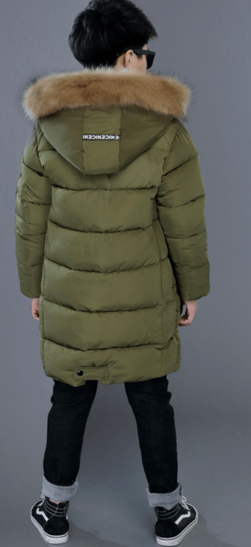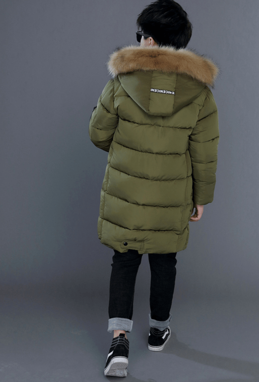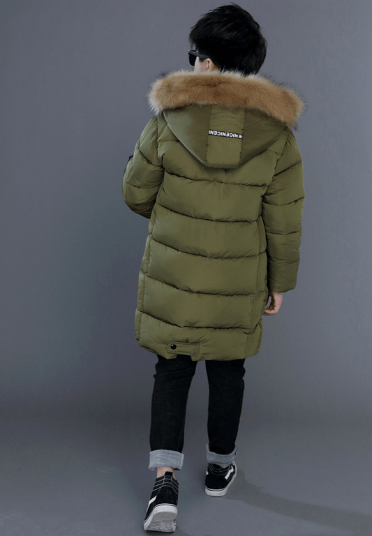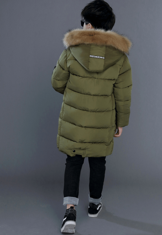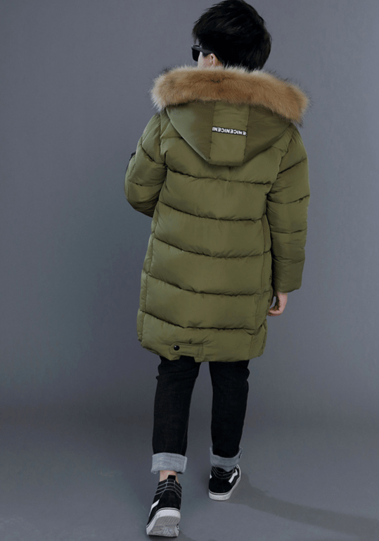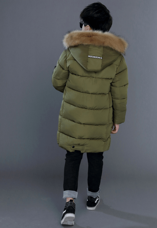 Parca larga y cálida para niño con capucha y piel.