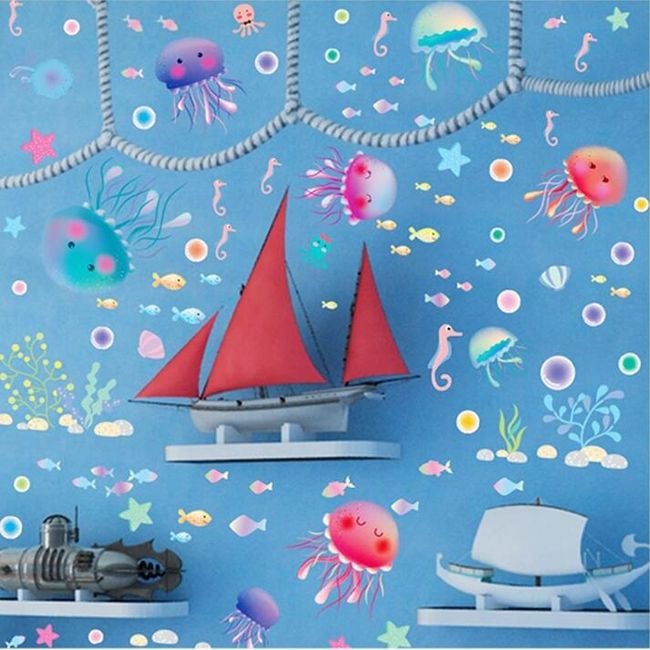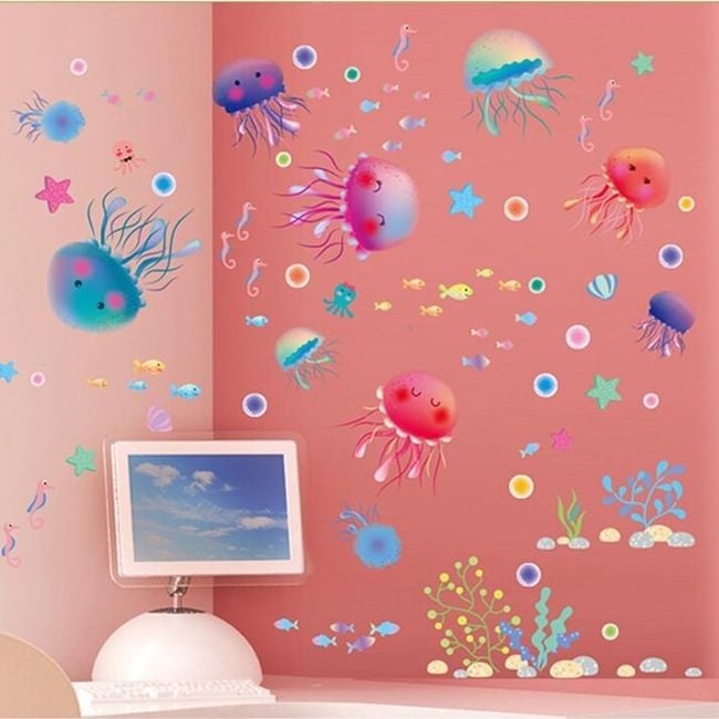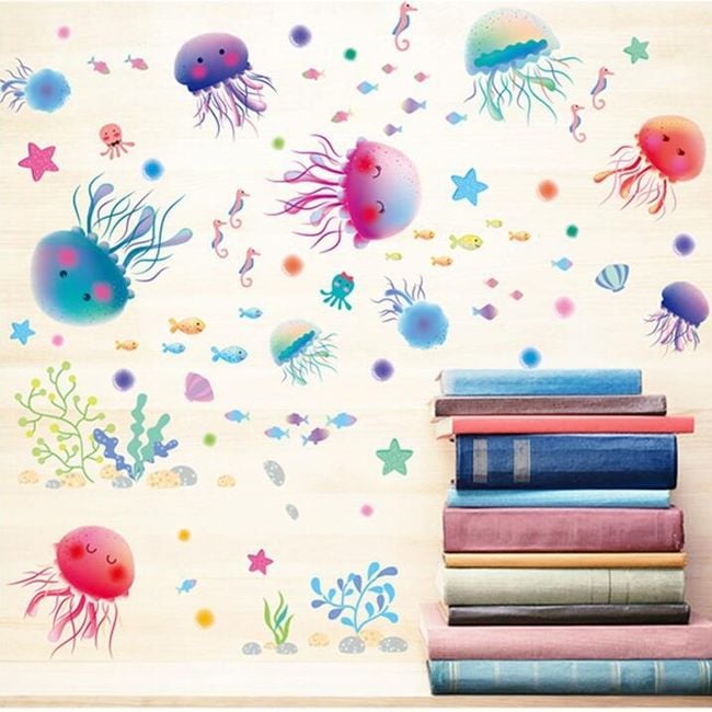 En la pegatina hay estrellas de mar y caballitos de mar.