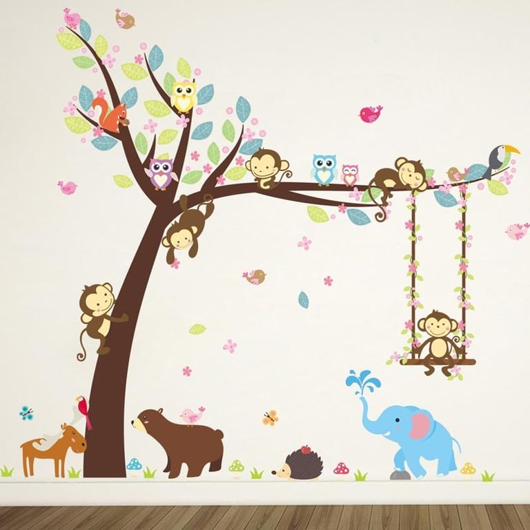 Vinilo adhesivo de pared con motivo de árbol y animales. Se entrega en una hoja de dos piezas de adhesivos. Dimensiones finales después de la aplicación 116 x 104 cm.