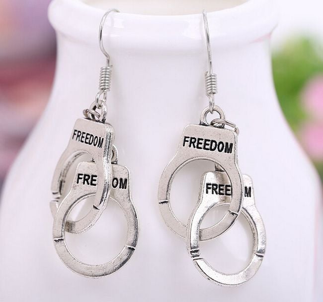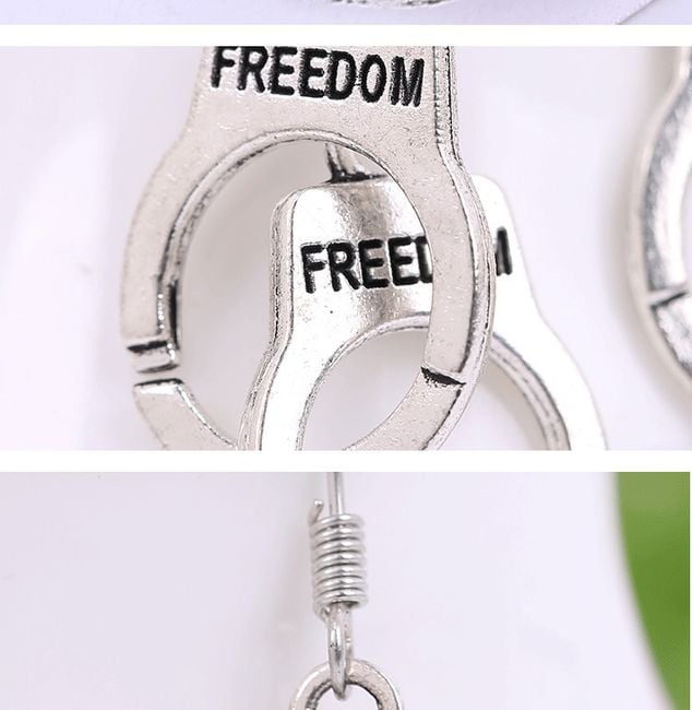 ¡Un complemento estiloso y original lo encontrarás en estos pendientes! Tienen forma de grilletes. Puedes llevar los pendientes prácticamente a cualquier lugar. En los grilletes encontrarás la inscripción en inglés Freedom (Libertad).