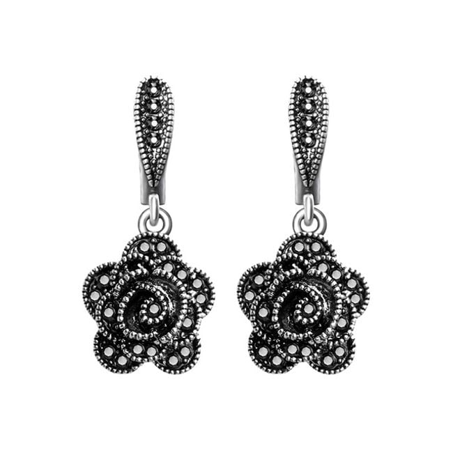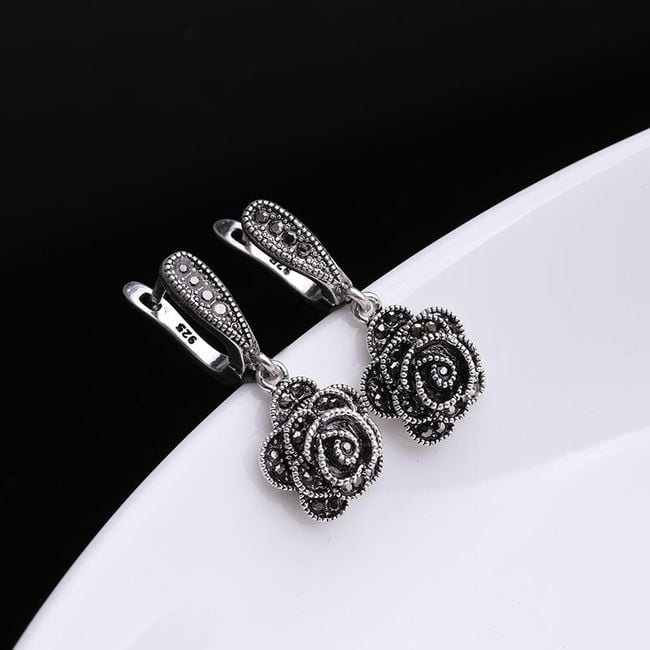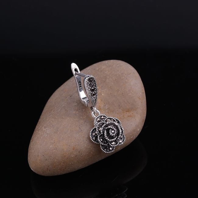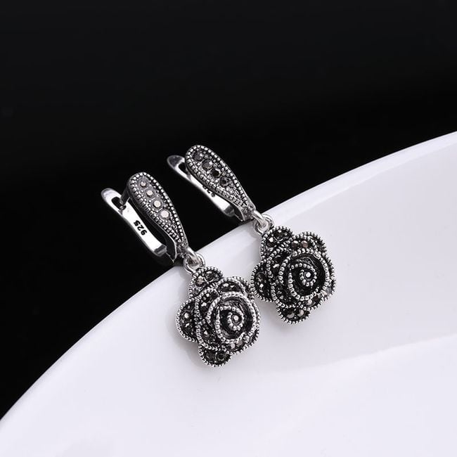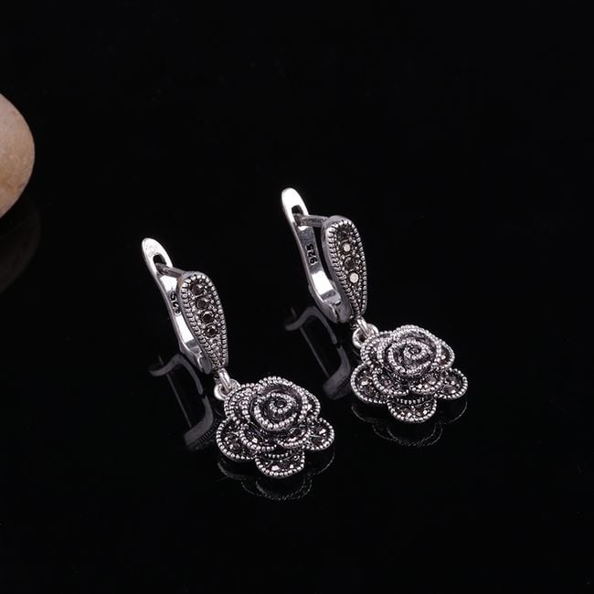 Los pendientes originales de estilo vintage están adornados con piedras negras.