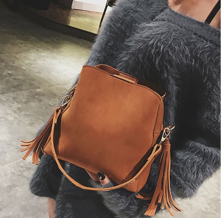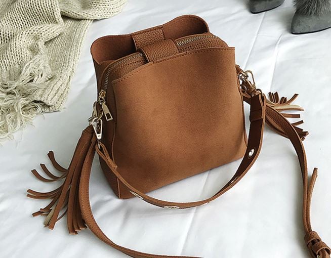 Pequeño bolso espacioso y estiloso con flecos.