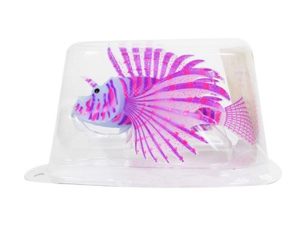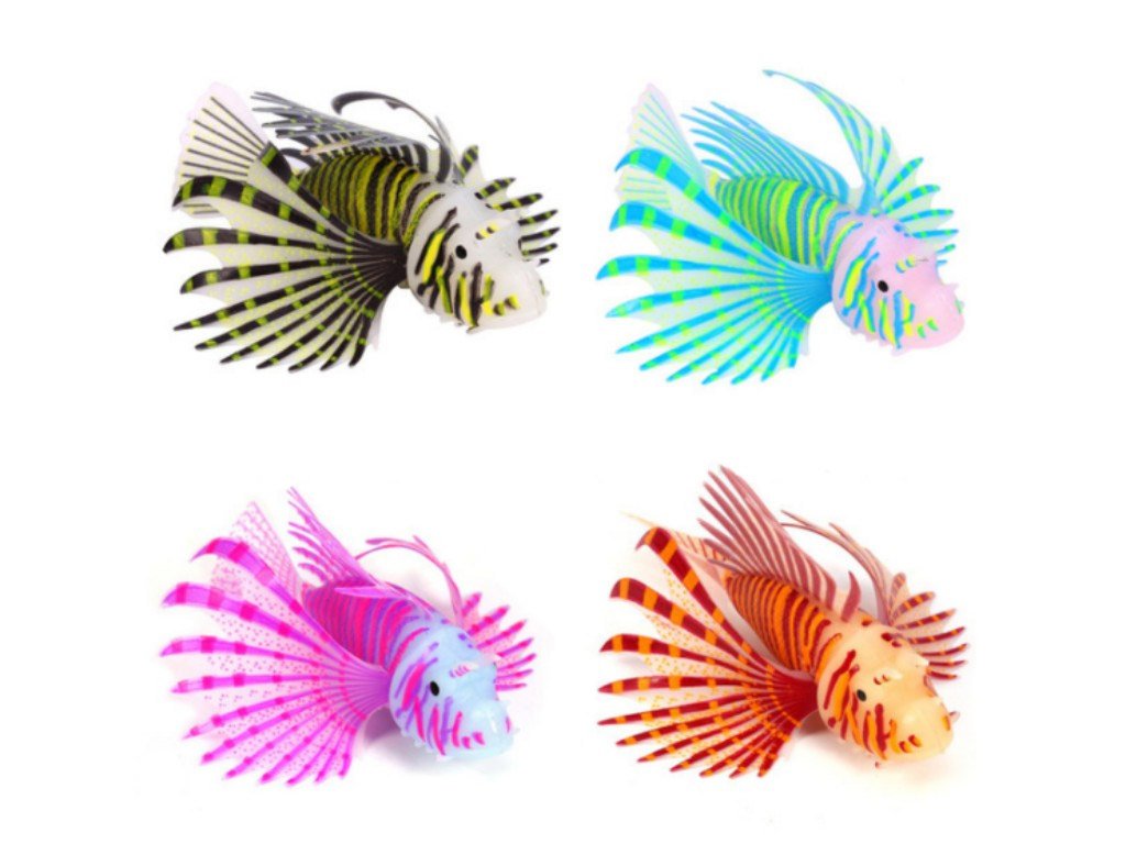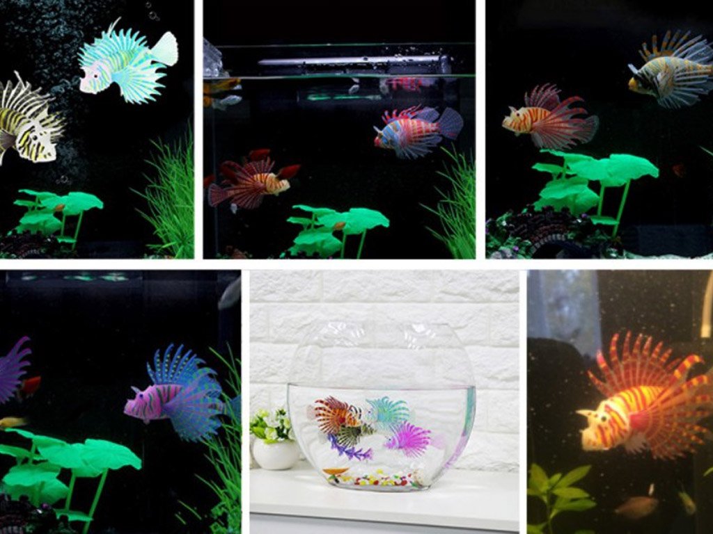 Los peces están hechos de silicona suave y flotan naturalmente en el agua del acuario. Están cubiertos con un polvo luminiscente no tóxico que brilla en la oscuridad después de haber sido iluminado adecuadamente.
