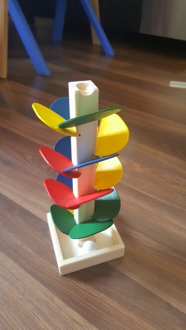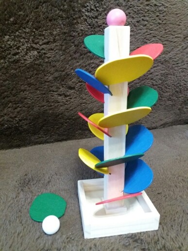 El paquete incluye: 1x base, 1x poste, 2x canicas, 16x placas de madera de colores