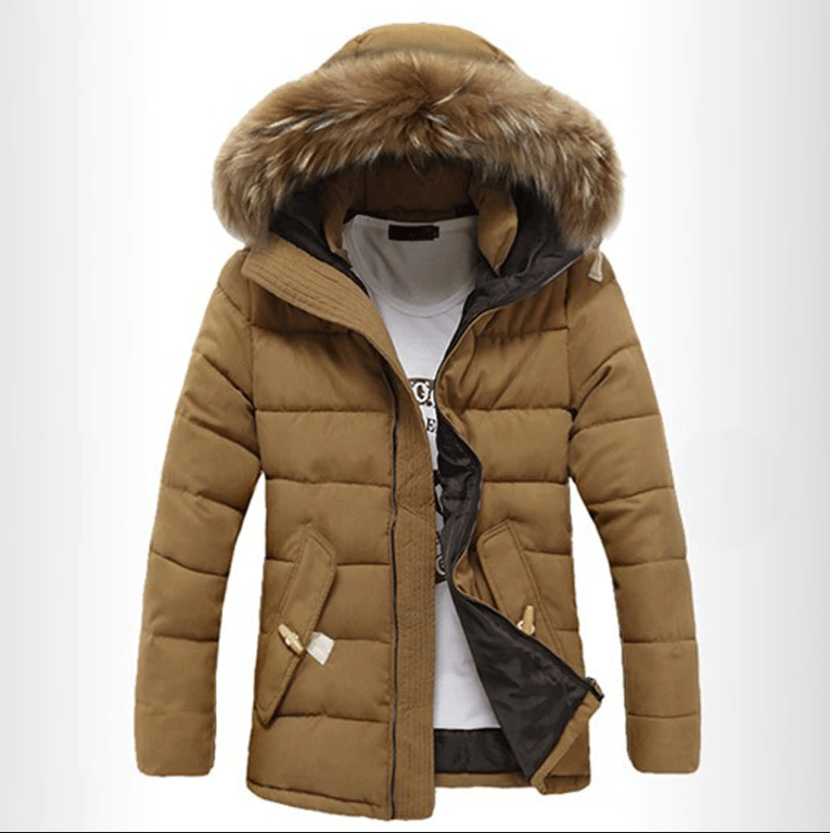 Chaqueta de invierno para hombre acolchada con cierre de cremallera, dos bolsillos laterales y capucha con un gran forro de piel cálido. Disponible en tres colores.