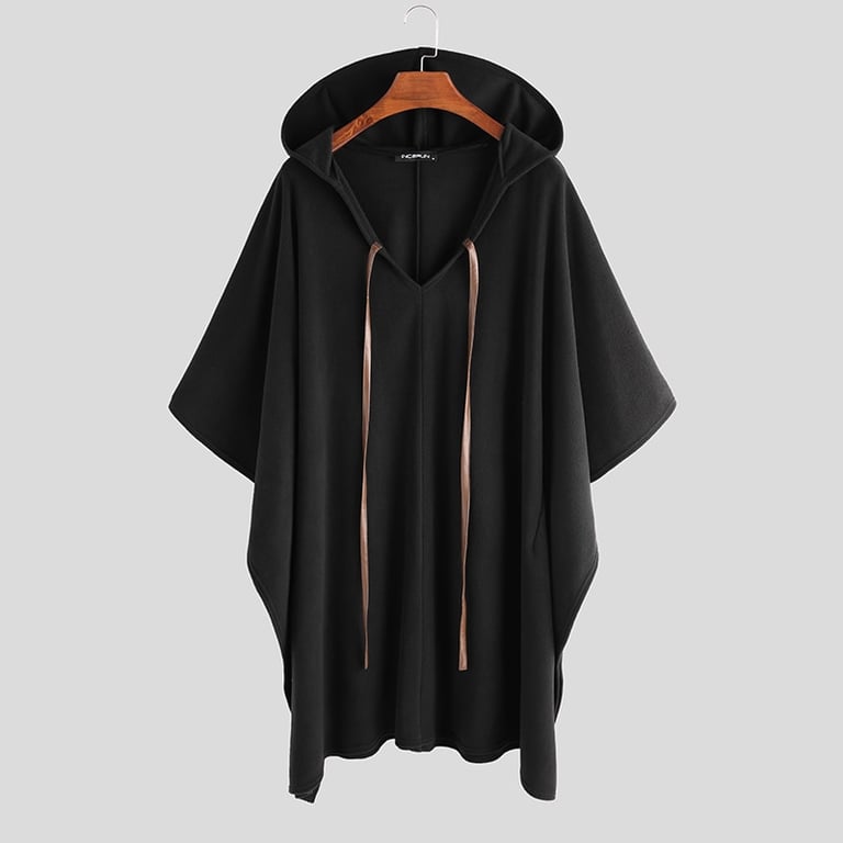 Poncho negro de moda para hombre con capucha y cordones