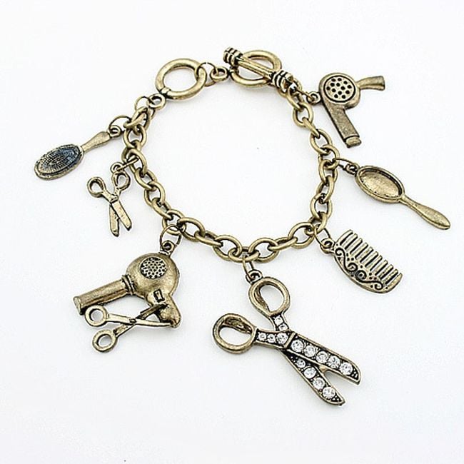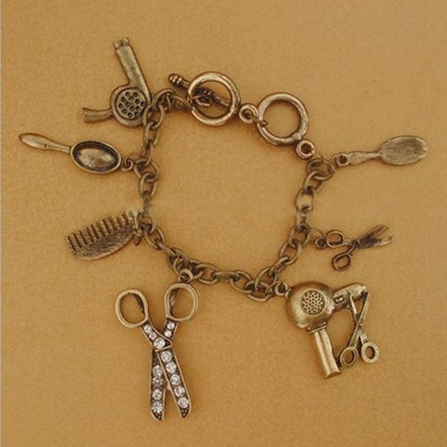 La pulsera de color cobre está adornada con una variedad de colgantes con temática de peluquería. Encontrarás, por ejemplo, un peine, un secador o unas tijeras.