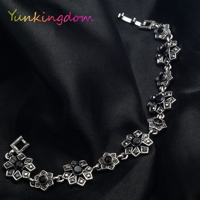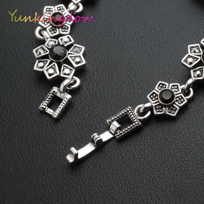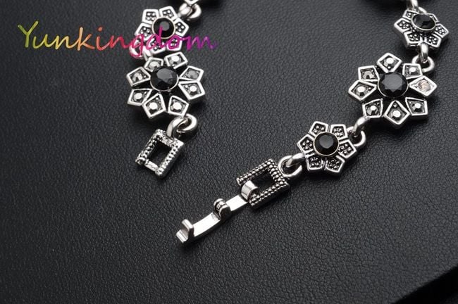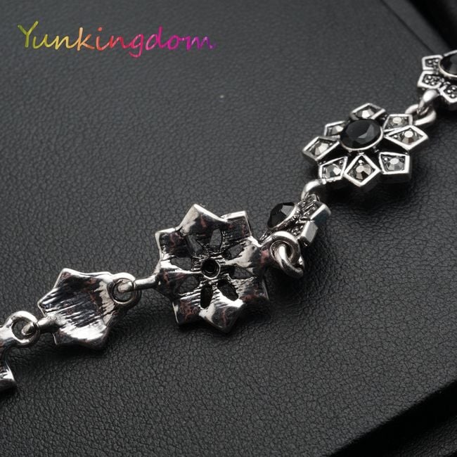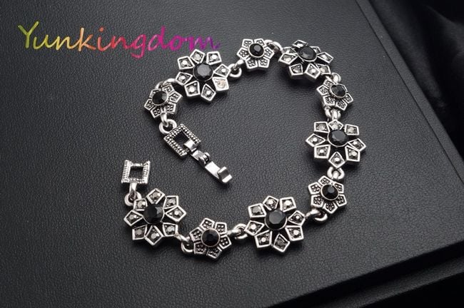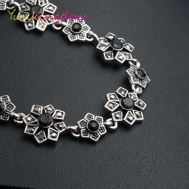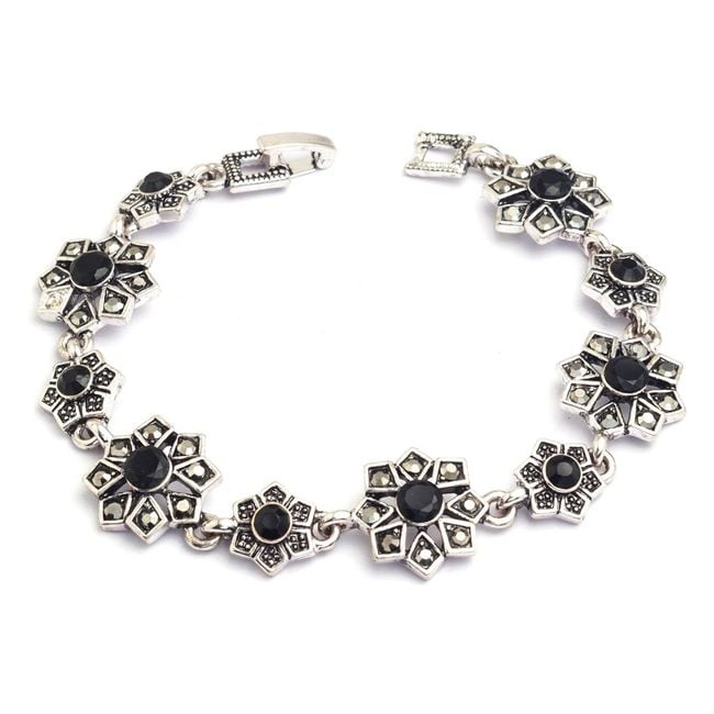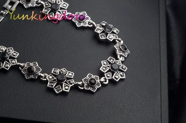 La pulsera está formada por flores de bisutería, que están decoradas en el centro con piedras negras.