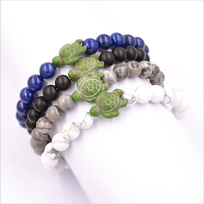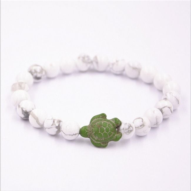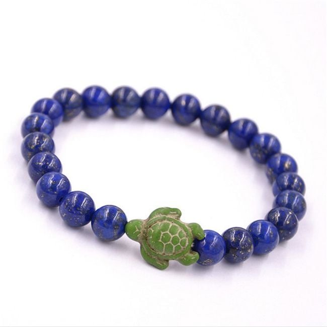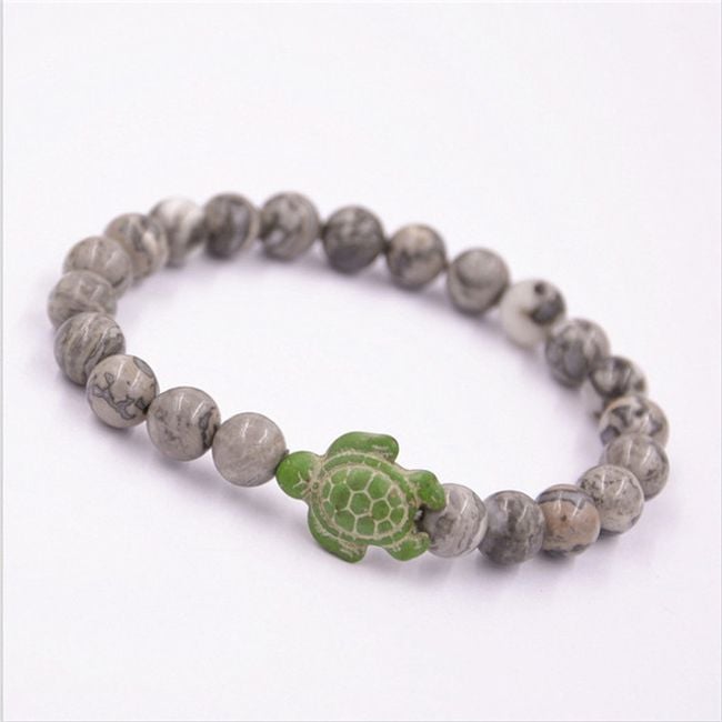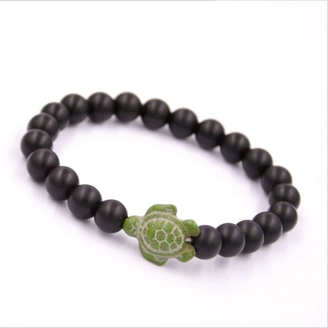 Pulsera unisex estilosa con piedras naturales y una tortuguita verde.