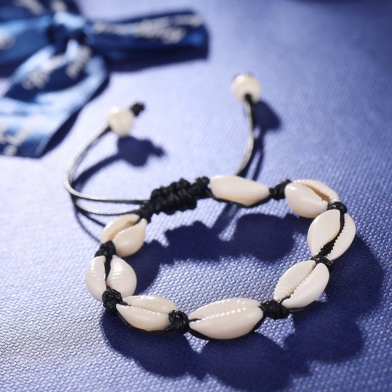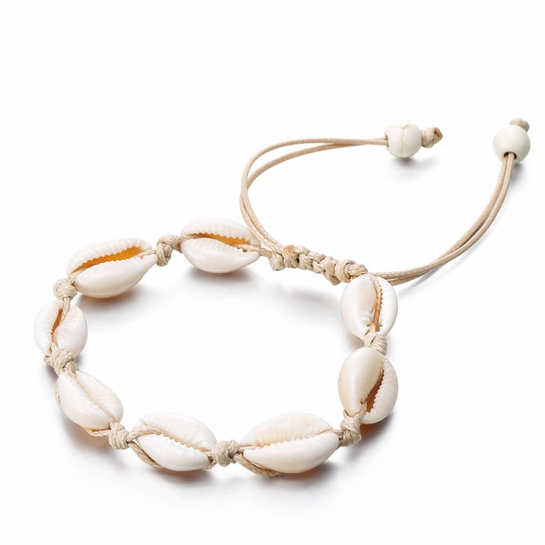 Pulsera de estilo Boho hecha de cuerda de nailon y conchas naturales de Kauri, decorada con fragmentos de nácar natural.