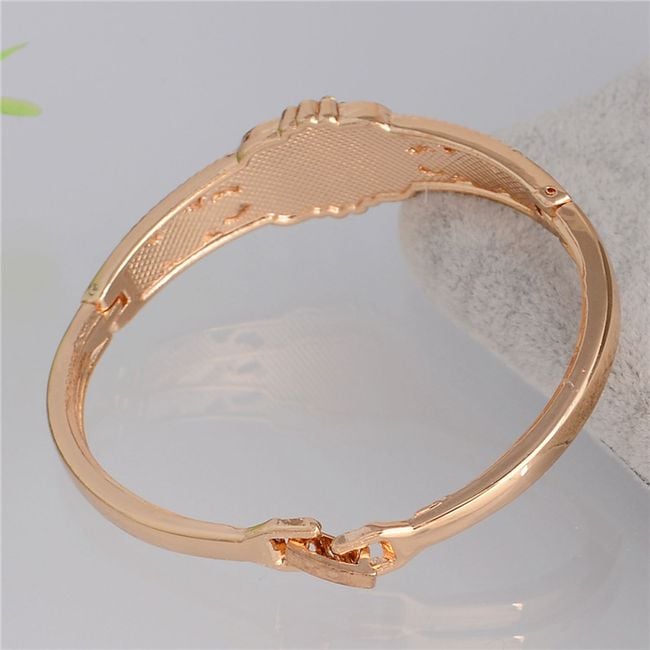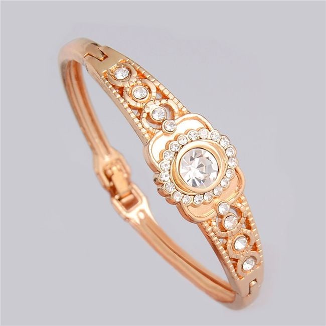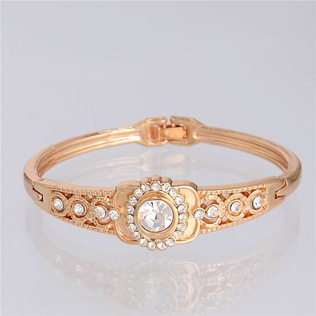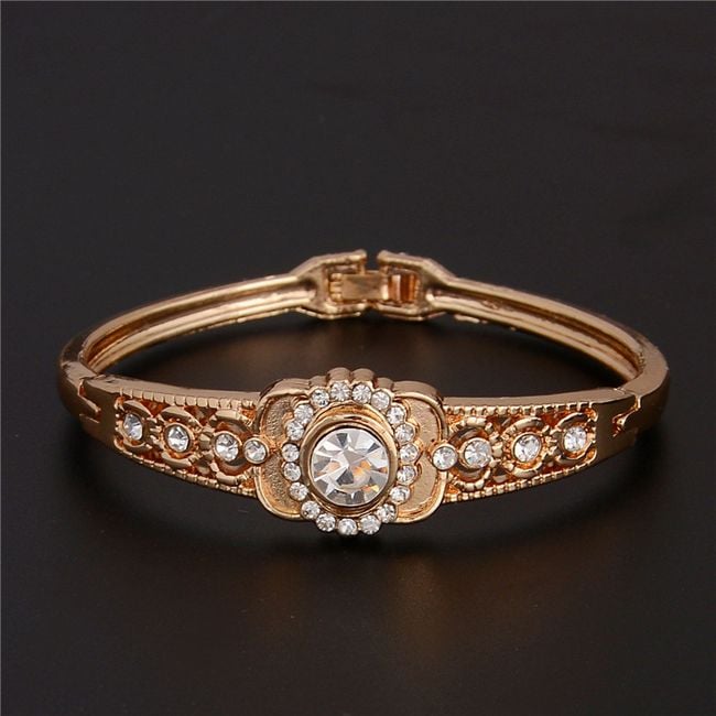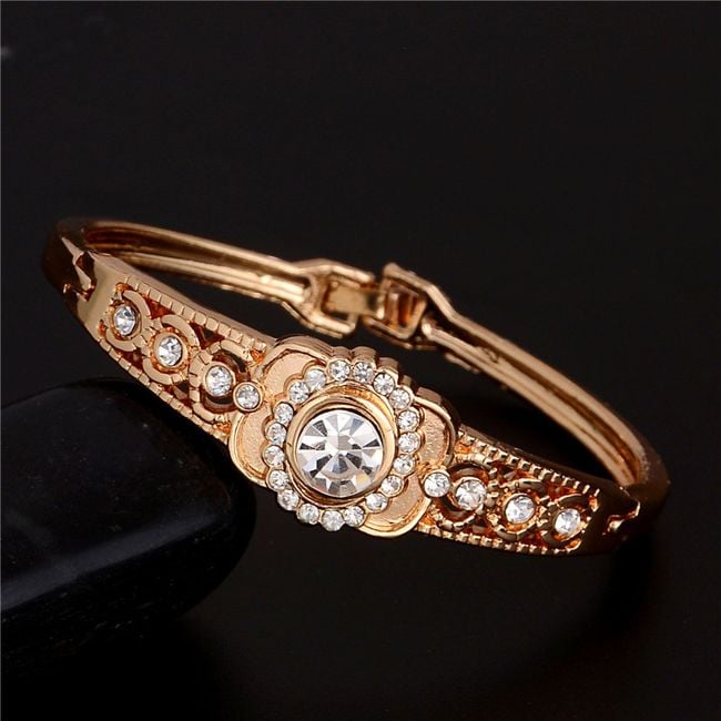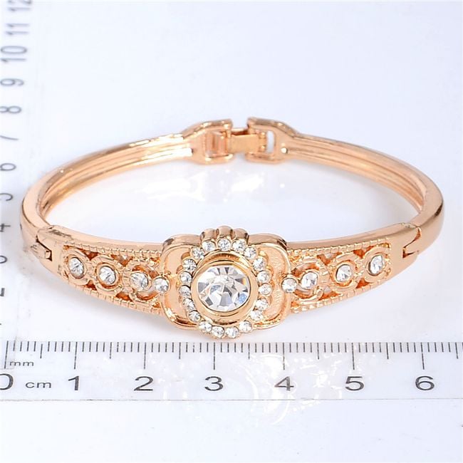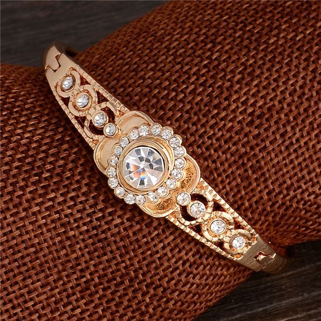 La pulsera en color dorado está adornada con piedras transparentes alrededor.
