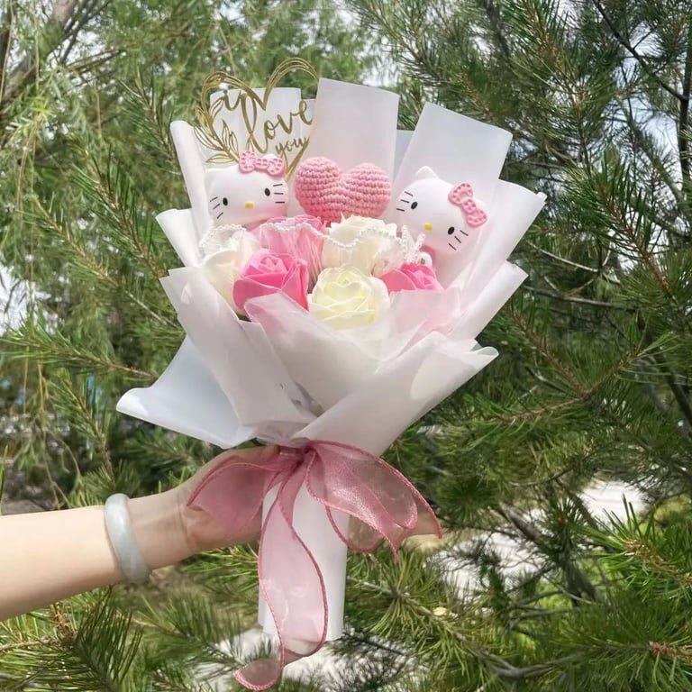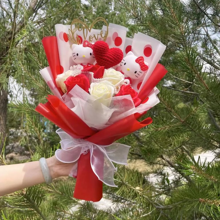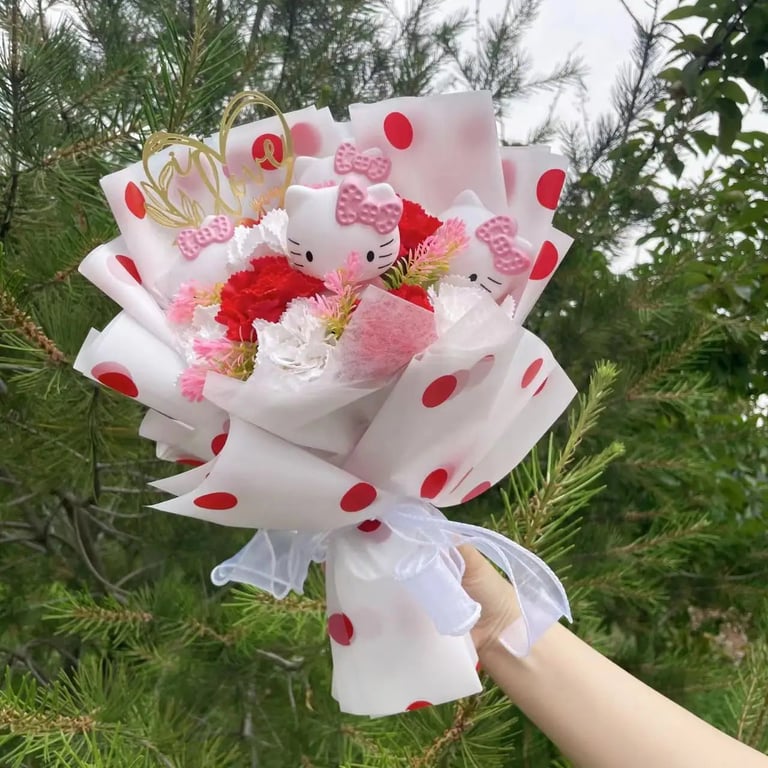 Ramo de cumpleaños para niña con peluche de Hello Kitty.