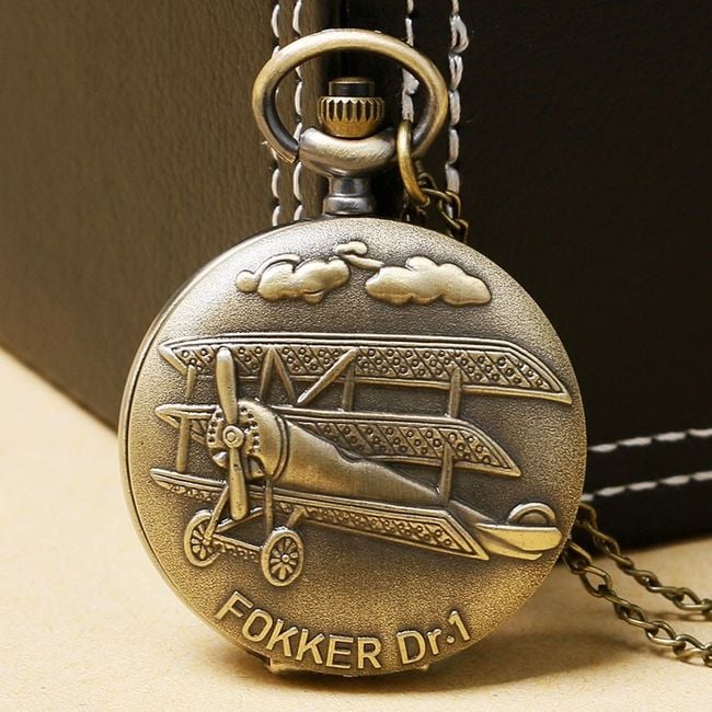 Estos relojes de bolsillo retro encantarán a todos los amantes de los aviones. En la parte frontal encontrarás una imagen del avión Fokker Dr.I. Este caza fue utilizado en la Primera Guerra Mundial. El reloj está equipado con una larga cadena que asegura un manejo cómodo.