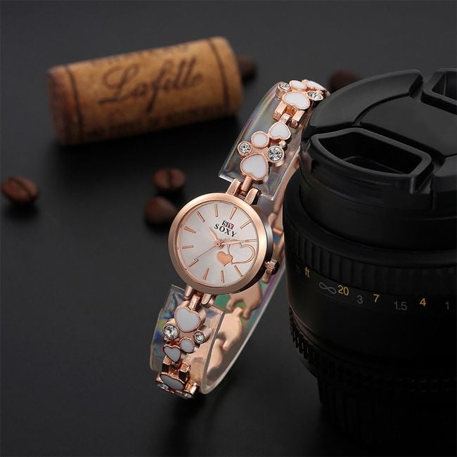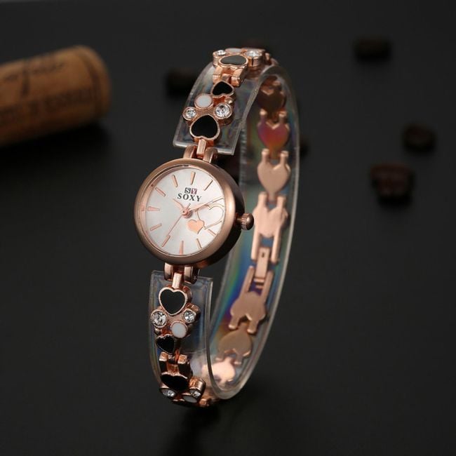 El reloj de pulsera para damas tiene una pulsera formada por pequeños corazones y piedras preciosas.