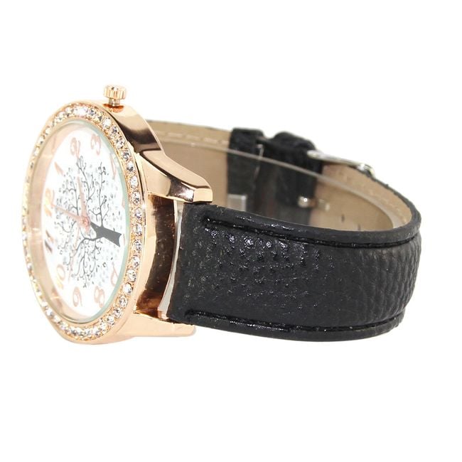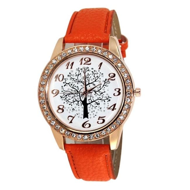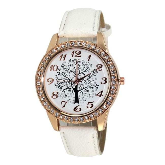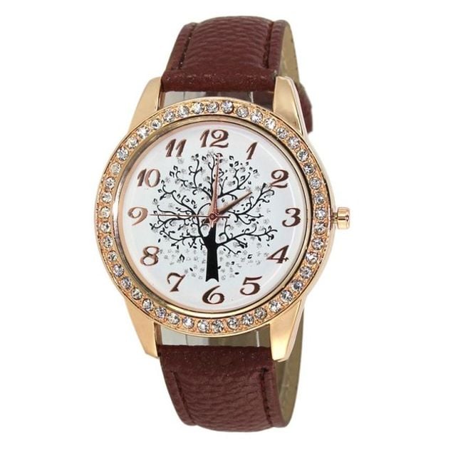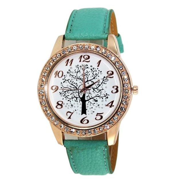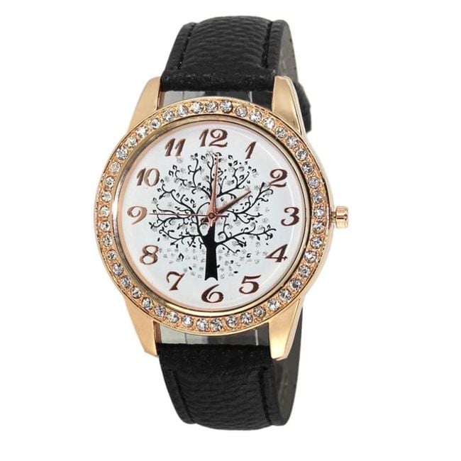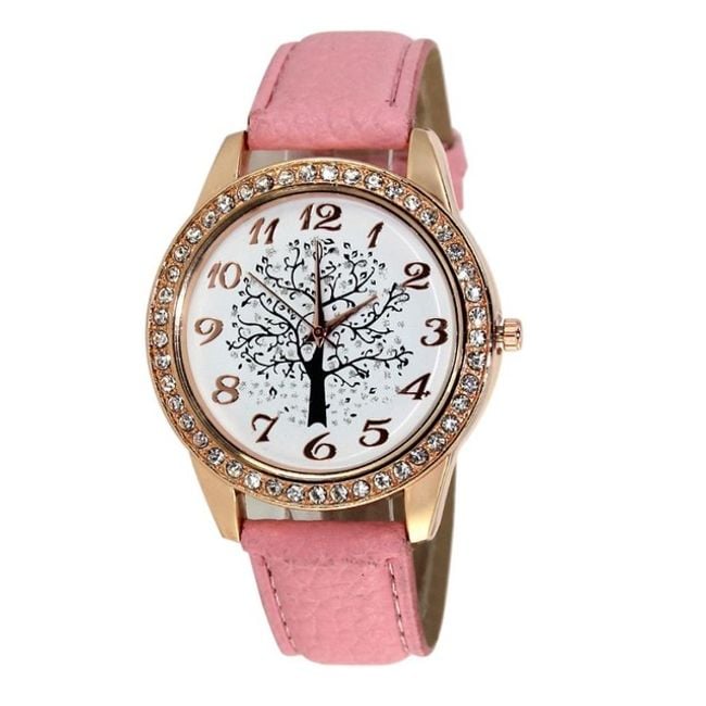 Los relojes de mujer tienen una esfera adornada con pequeños cristales. En la esfera se encuentra la imagen de un árbol frondoso.