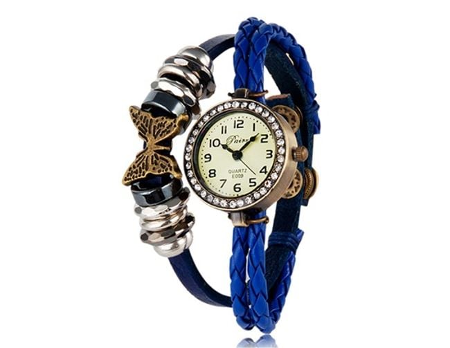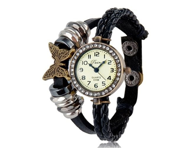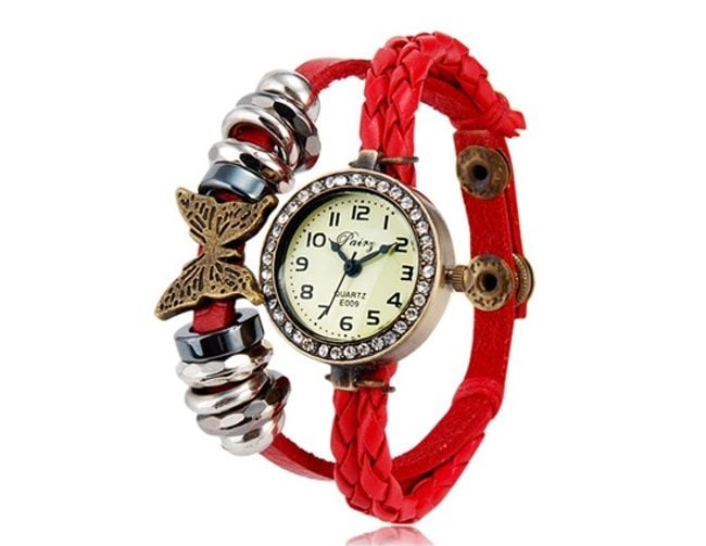Reloj de pulsera para mujer con un diseño retro ingenioso adornado con una mariposa. El cierre permite versatilidad en el tamaño y la esfera clara nunca te dejará dudar de la hora que es. Disponible en tres colores.