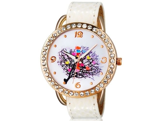 El reloj analógico tiene una esfera de color dorado, adornada con piedras de vidrio tallado. Las correas del reloj son de colores marrón, blanco y negro.