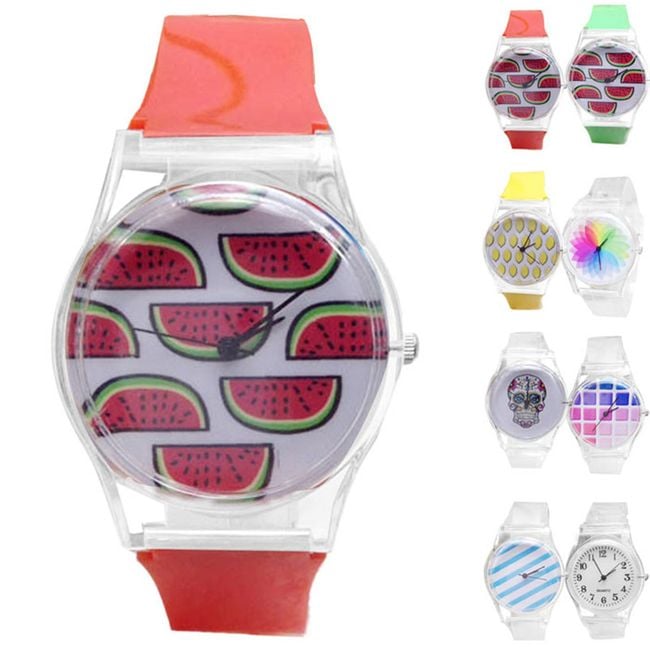 Relojes de silicona en colores jugosos con motivos veraniegos. Iluminarán y revitalizarán cualquier atuendo y siempre te levantarán el ánimo. ¿Prefieres refrescantes sandías, jugosos limones o elegantes rayas marineras? Tienes muchas opciones creativas para elegir.