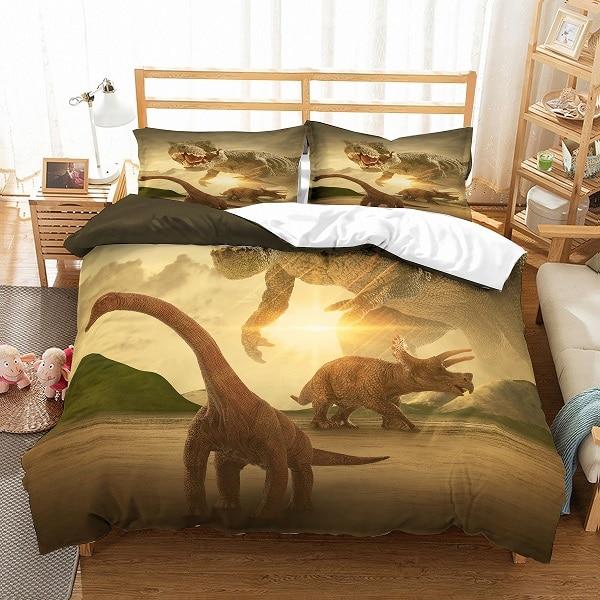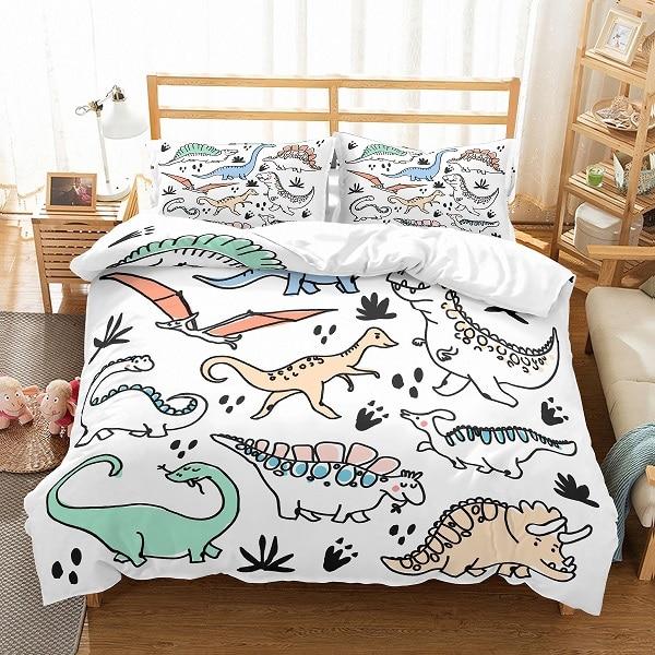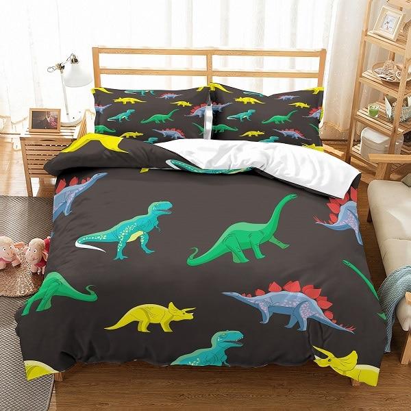 Juego de cama con estampado de dinosaurio en varios colores y tamaños.