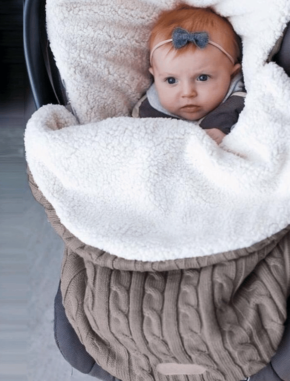 Saco de dormir cálido para bebés en cochecito y silla de auto. Diseño de punto. Interior de felpa acolchado. Adecuado para bebés de 0 a 12 meses. Disponible en varias opciones de color.