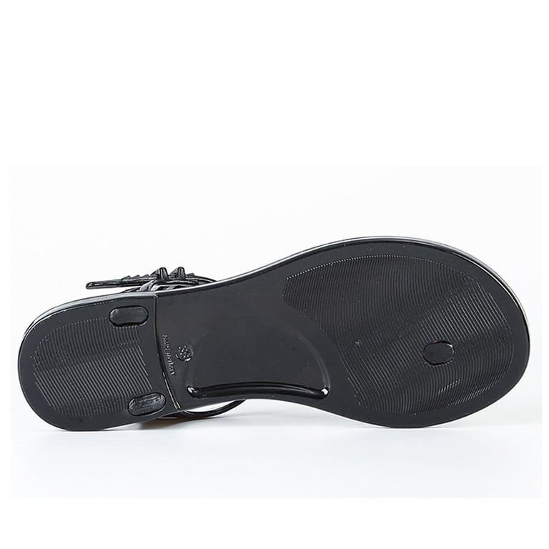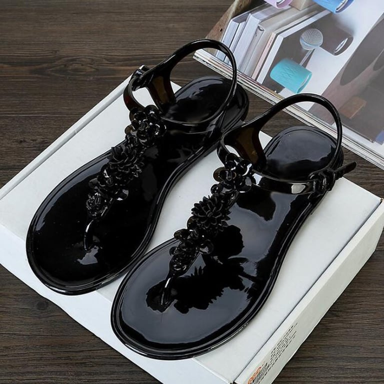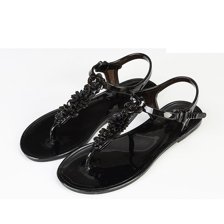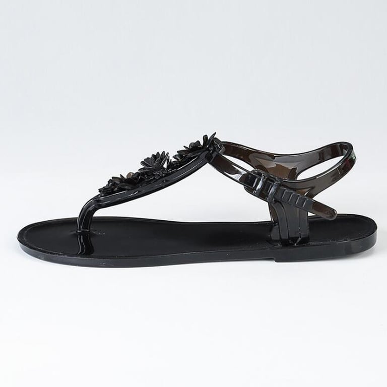 Sandalias de goma para mujer con tiras y adorno floral. Los zapatos tienen una suela plana sin tacón. Disponibles en tres variantes de color.