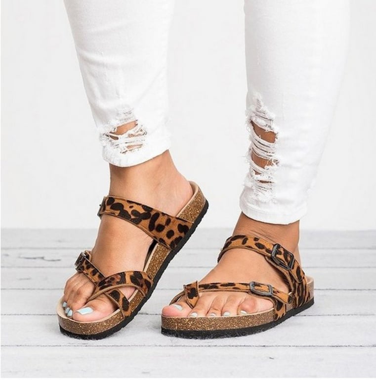 Sandalias de mujer con correas anchas y hebillas decorativas. Patrón de leopardo. Suela plana con plataforma.
