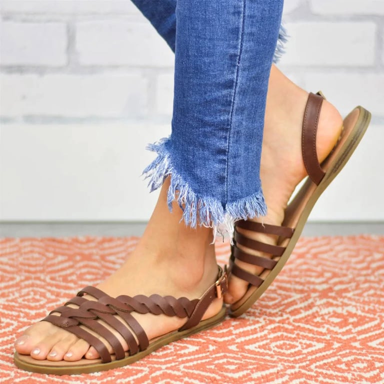 Sandalias de tiras para mujer con la punta y el talón abiertos. Tira trenzada sobre el empeine. Cierre con hebilla. Suela plana. Disponible en varias opciones de color.