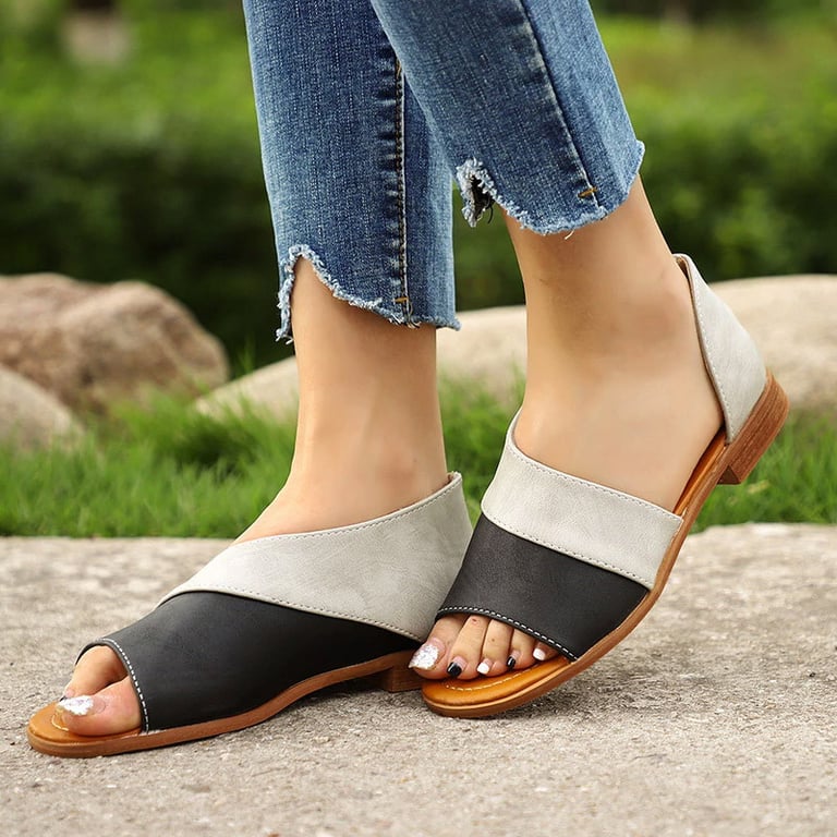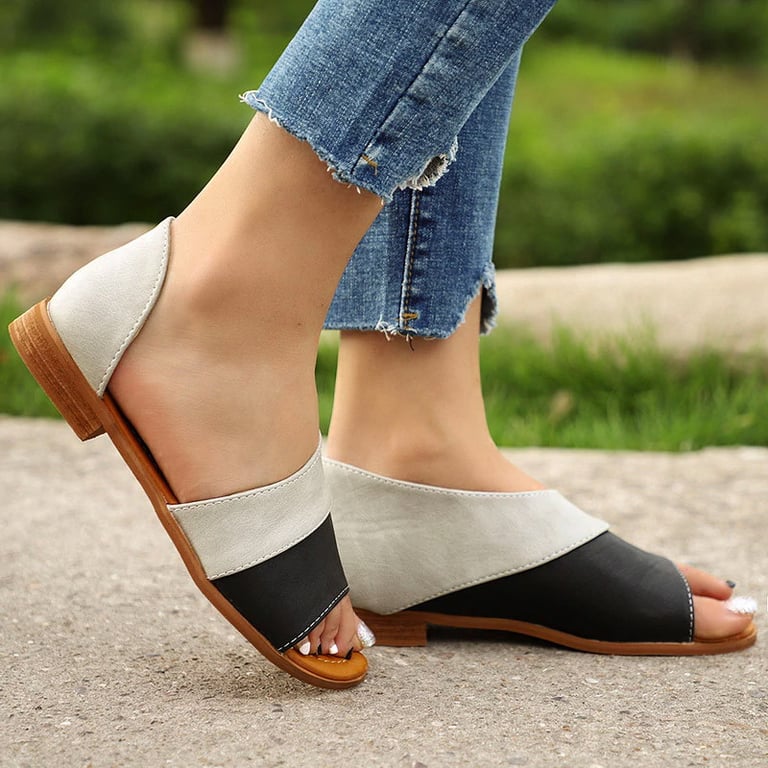 Sandalias de mujer con punta abierta y talón firme. Suela plana. Aspecto de cuero. Disponibles en varias opciones de color.