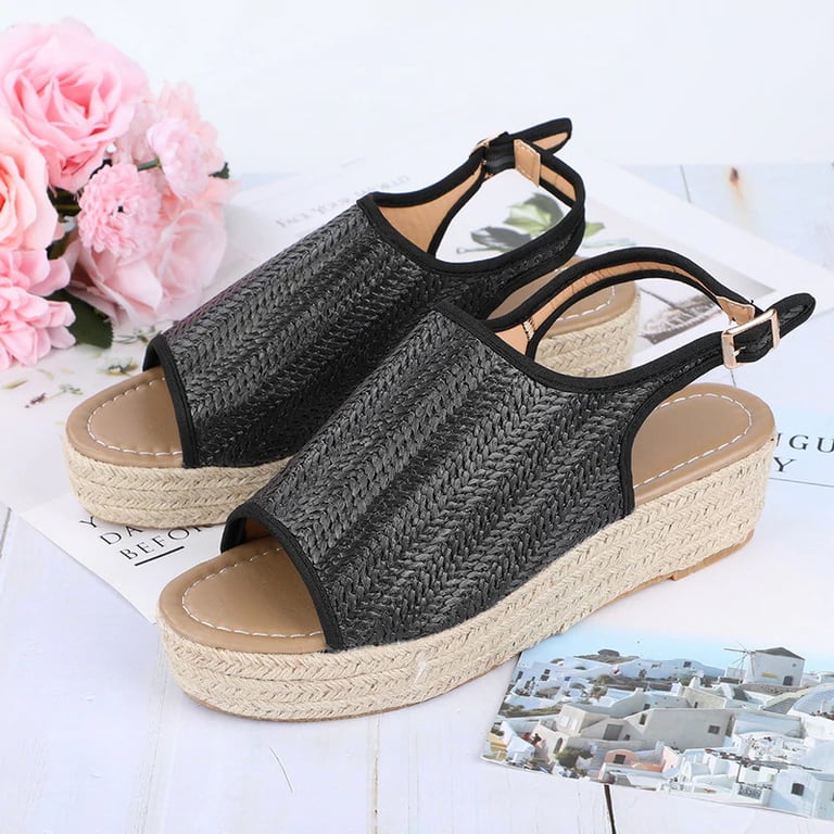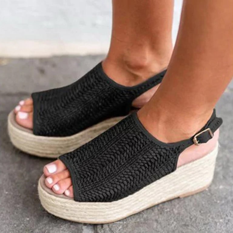 Plataforma de goma de 5-7 cm con una sensual cobertura del pie. Un delicado cinturón con hebilla asegura el pie contra el deslizamiento. Consigue un calzado cómodo para la temporada cálida.