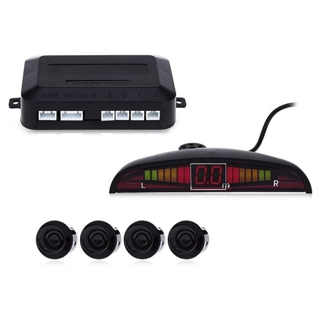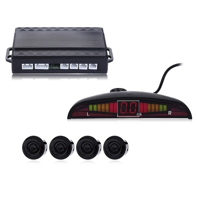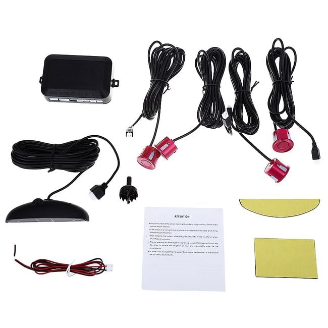 • Contenido del paquete: 1x caja de control, 1x pantalla LED, 4x sensor de aparcamiento, 1x cable de alimentación, 1x herramienta para agujeros, 1x manual del usuario (en inglés), 2x pegatina