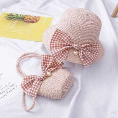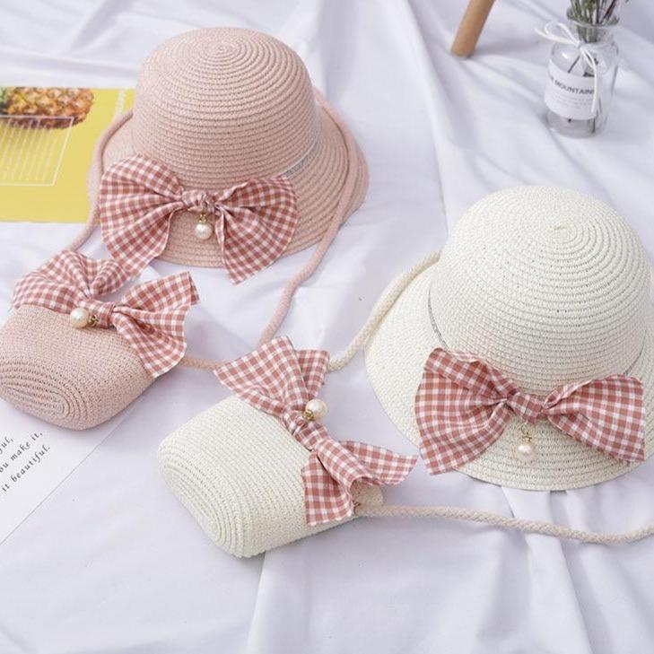 Sombrero de paja de verano para niñas. Hay varias colores disponibles y una opción con un bolso a juego.