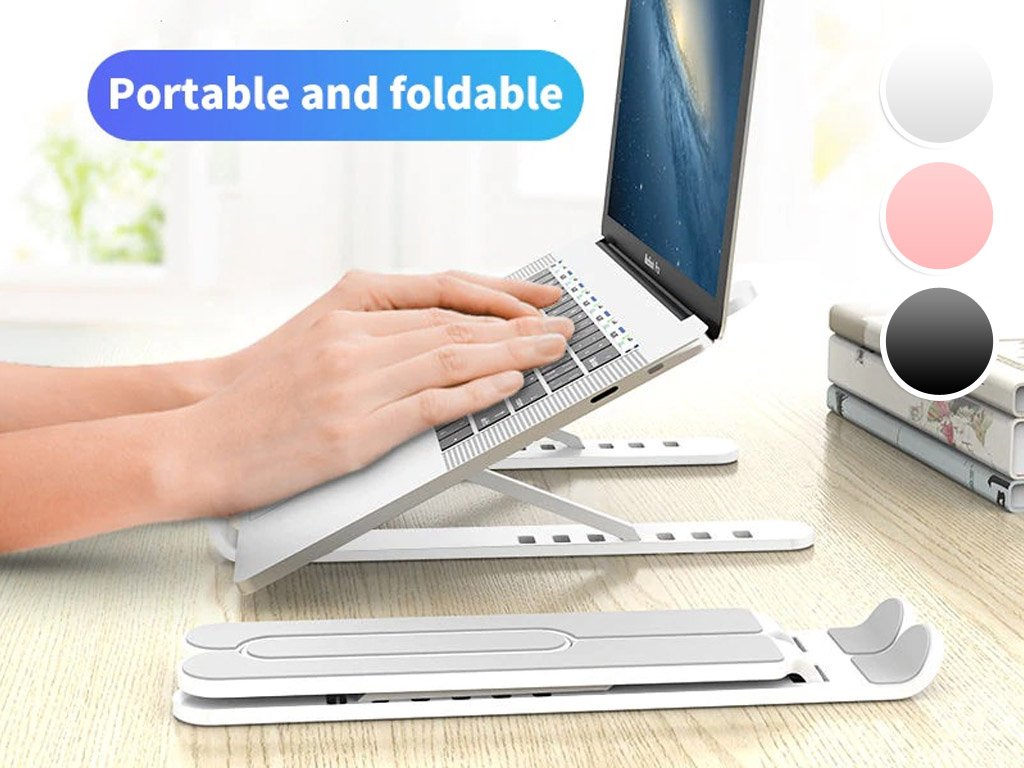 Soporte plegable práctico para MacBook, iPad y otros portátiles o tabletas de hasta 15,6". La calidad está garantizada por una sólida construcción de aluminio con almohadillas antideslizantes. Tres colores disponibles.