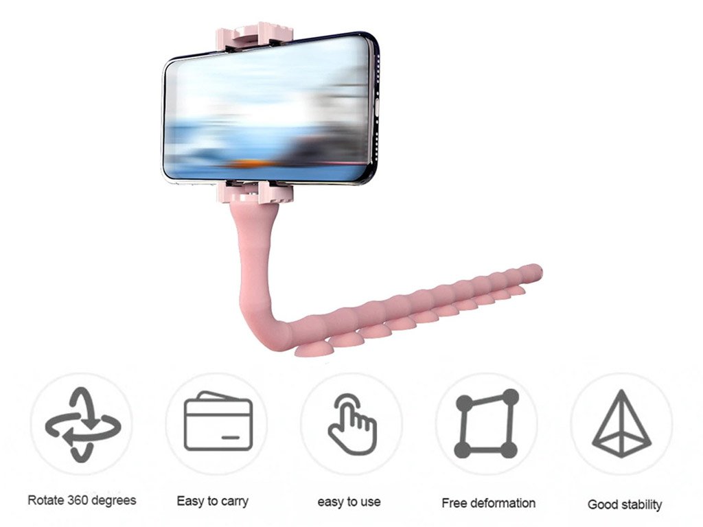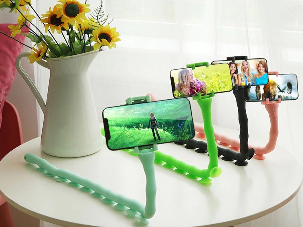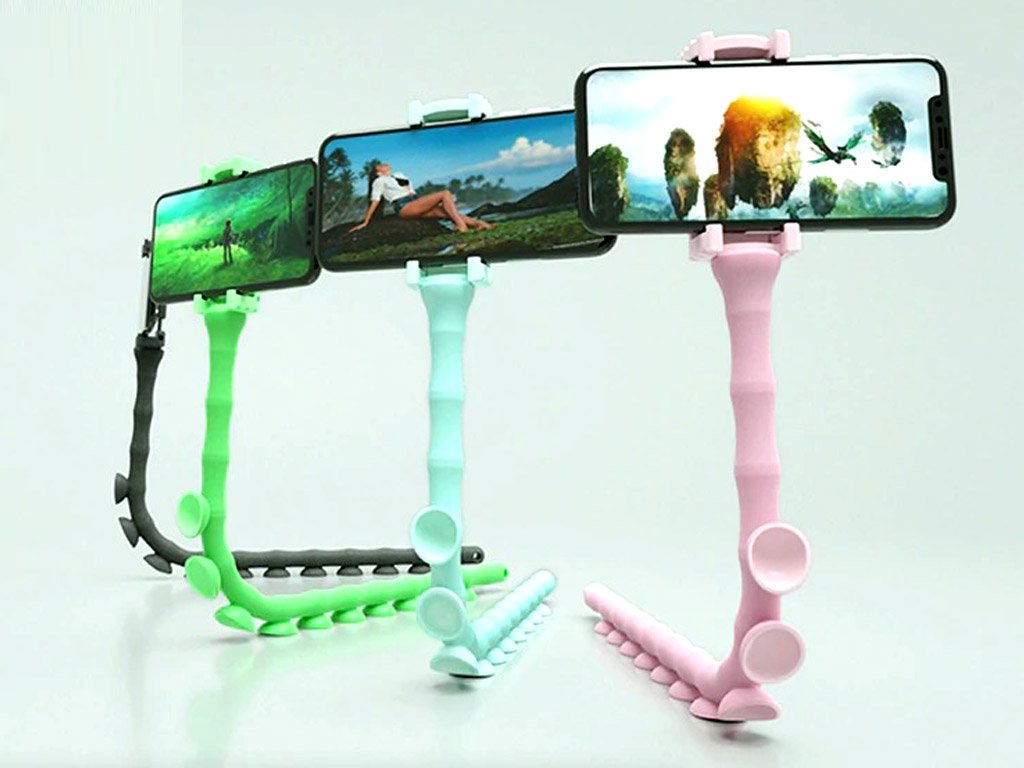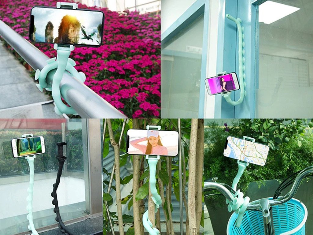 El soporte universal Oruga, por su apariencia, recuerda al diseño adorable de un gusano. Su potente función de adsorción permite no solo enrollarlo alrededor de cualquier rama o barandilla, etc., sino que también se puede fijar a cualquier superficie limpia en la oficina, en una mesa, pared, puerta, azulejos, etc., mediante ventosas. El clip para el teléfono móvil tiene un tamaño telescópico de 7,4 a 10 cm, lo que lo hace adecuado para teléfonos móviles de hasta 6 pulgadas.