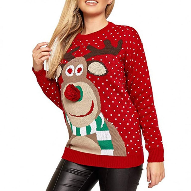 Suéter de punto para mujer con motivo navideño de reno. Pompon peludo en lugar de nariz. Corte holgado con mangas largas y escote redondo. Varias opciones de color.