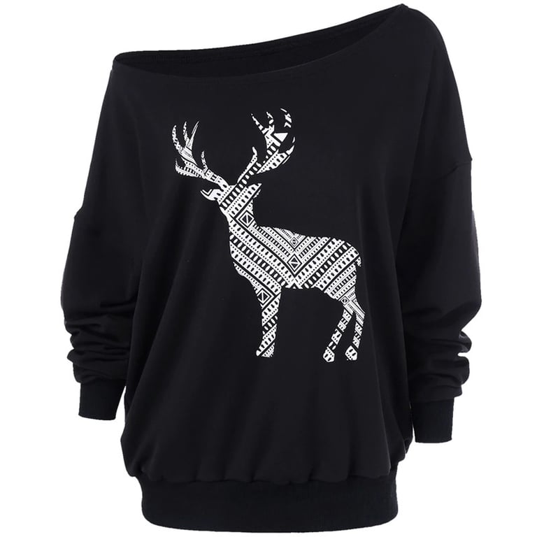 Consigue una sudadera estilosa con el motivo de un ciervo para la fiesta de Navidad. Provocarás a los hombres con un hombro al descubierto y estarás chic toda la noche.