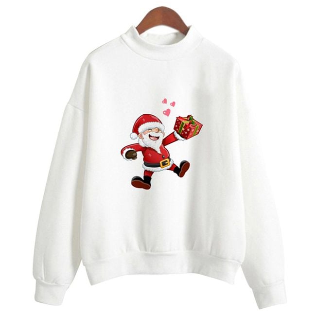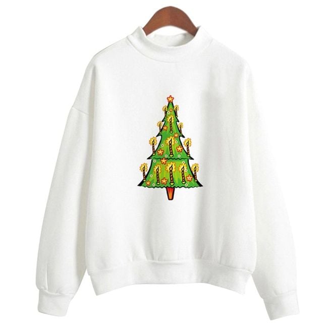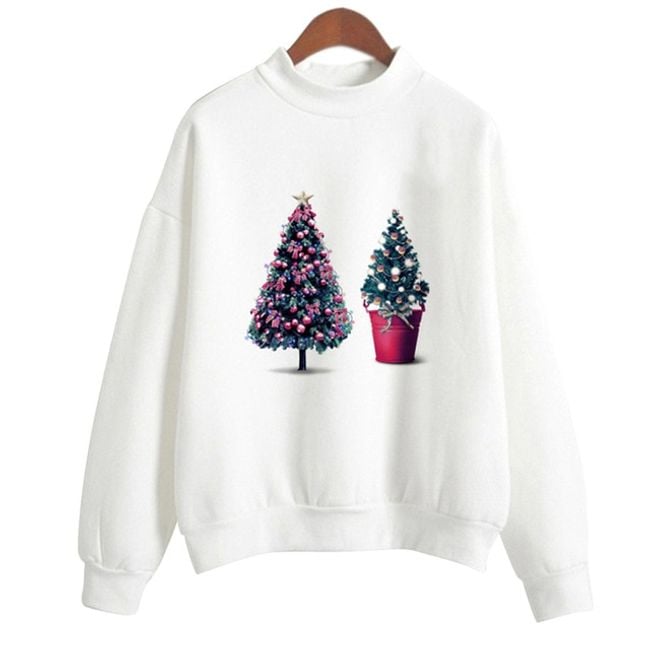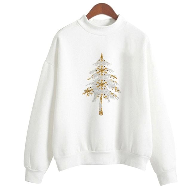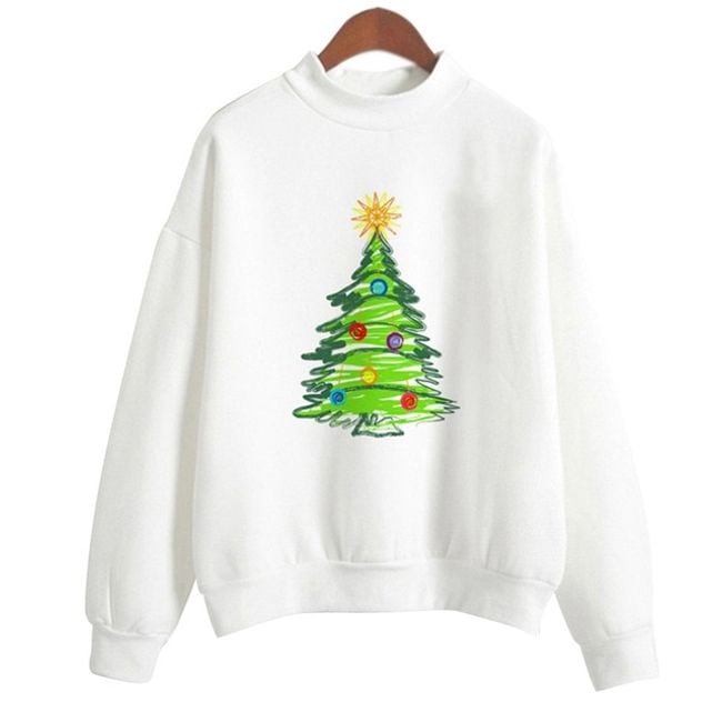 La sudadera es de color blanco, tiene un corte sencillo y un lindo estampado inspirado en la Navidad, por lo que se puede elegir, por ejemplo, un estampado con un arbolito o con Santa.