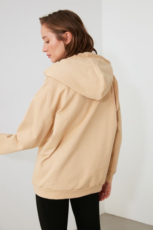 Sudadera beige con un estampado original de cara. Adecuada para el uso diario.
