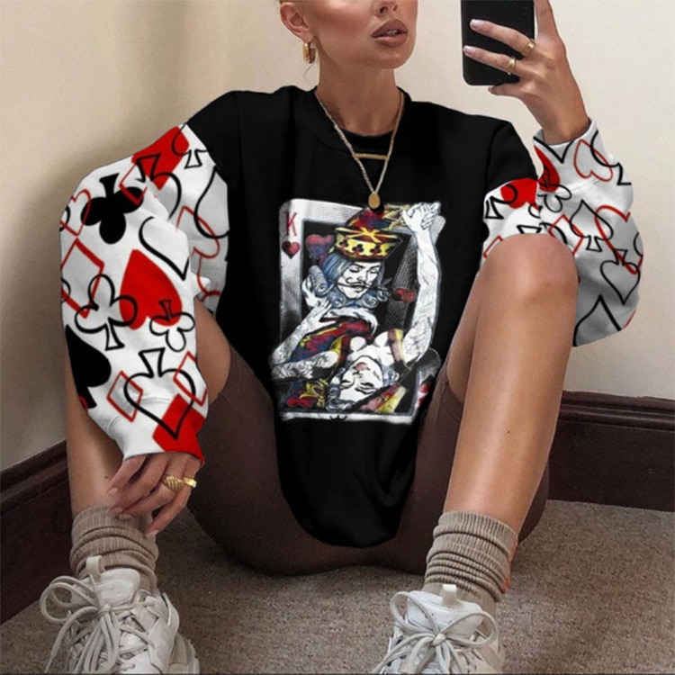 Sudadera original y estilosa para chicas, con adornos de cartas en las mangas. Ideal para uso diario.