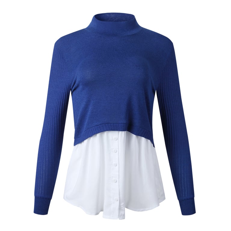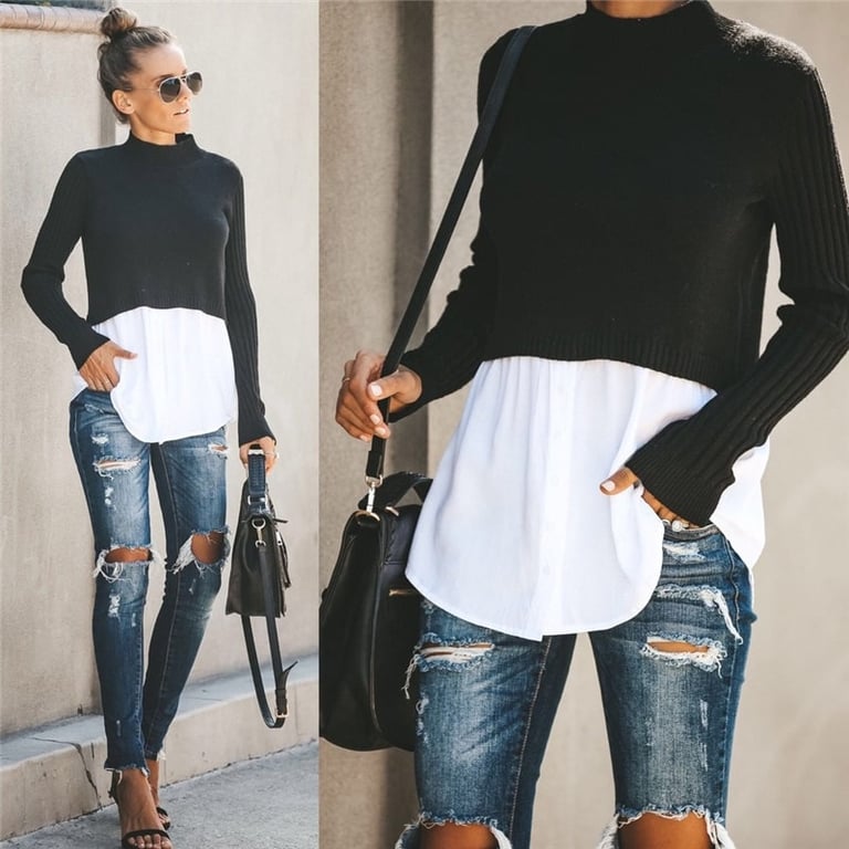 Esta pieza ingeniosamente elegante combina un ligero suéter de manga larga con una camisa de botones.