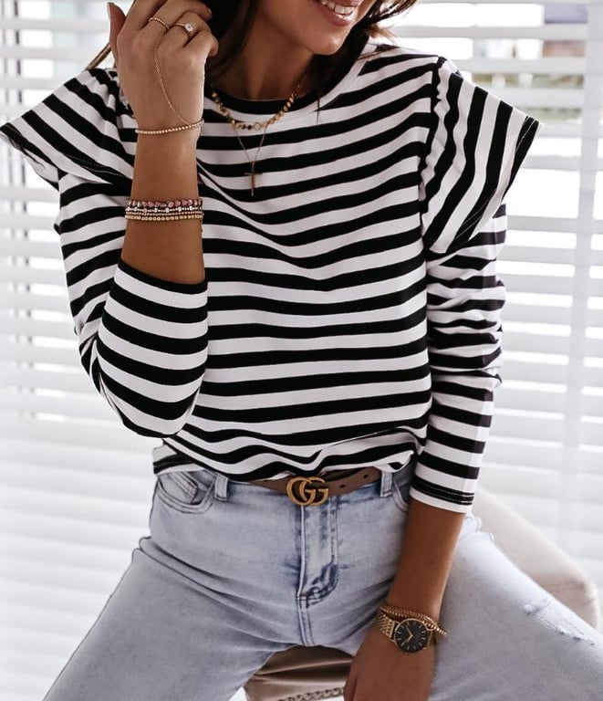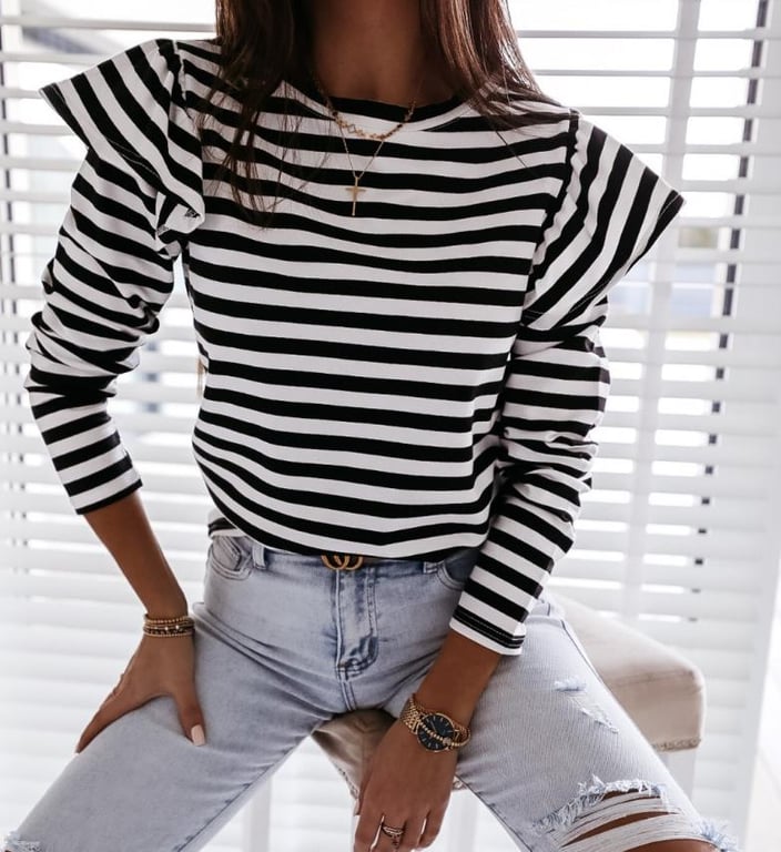 • Etiquetas: suéter de mujer, suéter a rayas, suéter con volantes, camiseta, rayas, franjas
