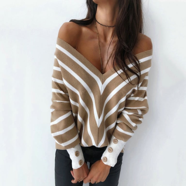 • Etiquetas: suéter de rayas, suéter con escote, moda femenina, escote en V,