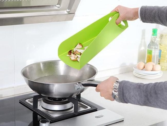 Una práctica tabla de cocina, con la que gracias a los bordes flexibles puedes fácilmente y rápidamente verter los ingredientes picados en la olla o en la sartén sin desorden.