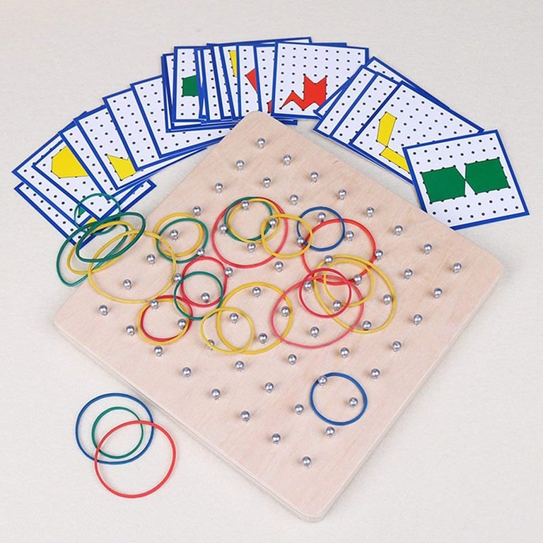 La tabla incluye papeles con formas que los niños crean utilizando gomas elásticas.