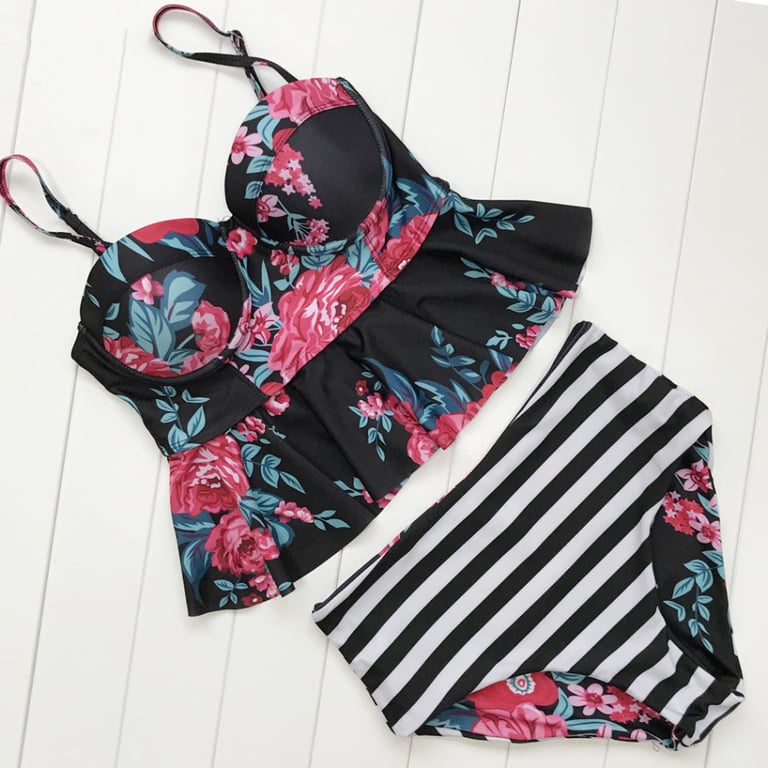 Bañadores de tankini para mujer con estampado veraniego. Top con tirantes finos y volantes. Parte inferior de cintura alta, reversible.
