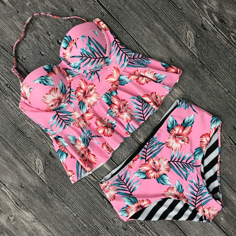 Traje de baño de tankini para mujer con estampado veraniego. Top con tirantes finos y volantes. Parte inferior de cintura alta, reversible.