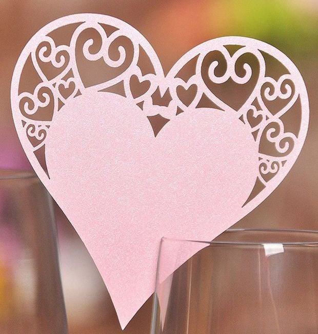 Las tarjetas en forma de corazón adornarán los vasos con brindis en la recepción de la boda. Esta decoración original también ayudará a mostrar a los invitados dónde está su lugar en la mesa.