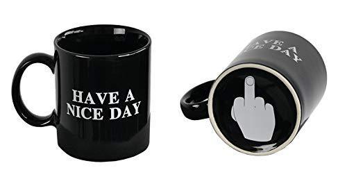 Taza divertida y original con la inscripción 'Have a nice day' y una imagen del dedo medio levantado en la parte inferior. Ideal como regalo.